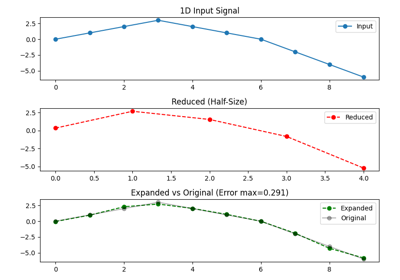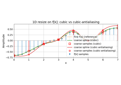 Examples using the Resize module on multidimensional samples, specially 1D and 2D. We also show the equivalence with the Spline Interpolation module methods where relevant.