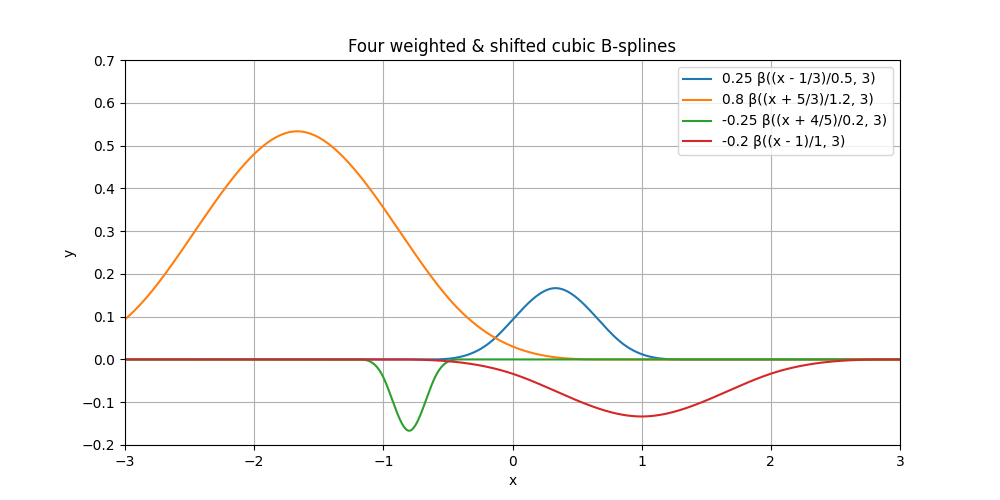 Likewise, we could play with any other combination of (shift, shrink, weight) to obtain a zoo of other functions, including some with negative weight. In the present case, all of them would be said to be cubic B-splines, up to their individual (shift, shrink, weight). Here are some.