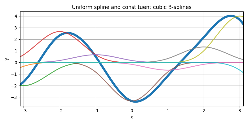 Here is some uniform spline (thick curve), along with its additive constituents (arbitrarily weighted and integer-shifted B-splines of same degree, thin curves).
