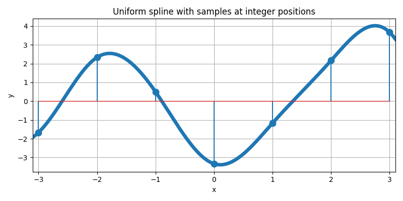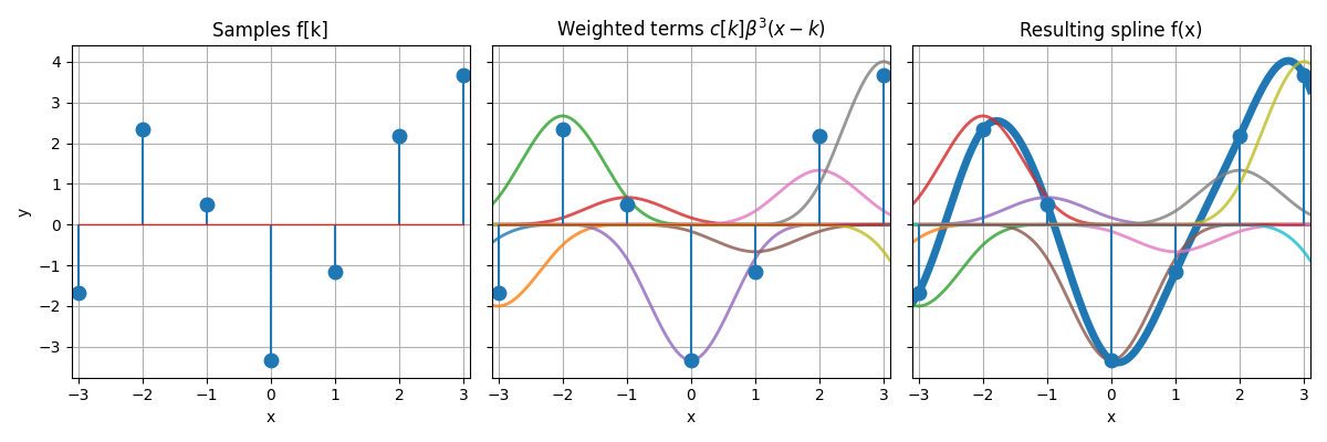 The example Interpolate 1D Samples illustrates how a 1D sequence of samples \(f[k]\) is interpolated by a cubic B-spline, and how this spline can be written as a sum of shifted and weighted basis functions.