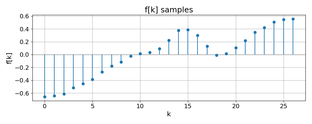 The first figure shows the discrete samples \(f[k]\) alone: